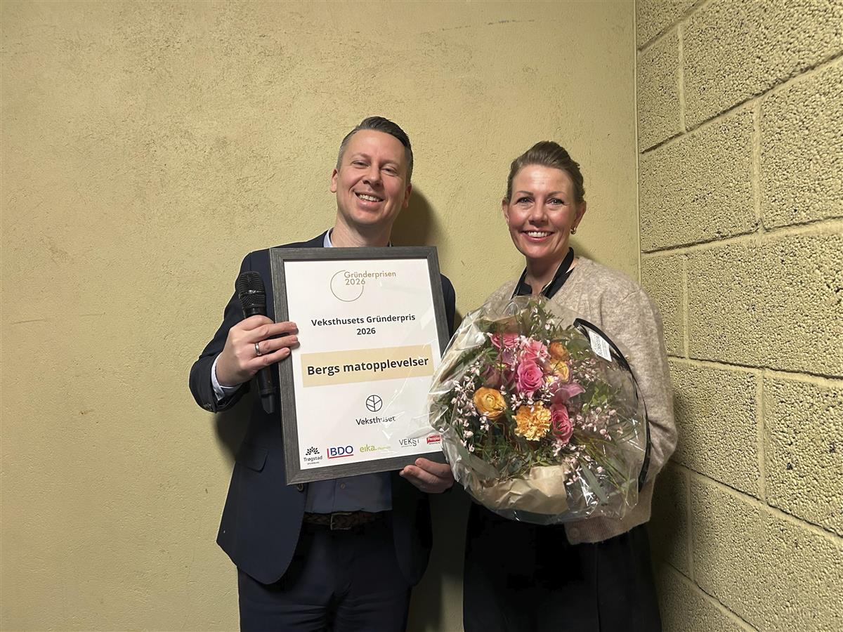Bergs matopplevelser vant Veksthusets Gründerpris på Årskonferansen 2026. Her med administrerende banksjef i Trøgstad Sparebank Lars Andre Dingstad-Eriksen.Sparebankenes Næringspris