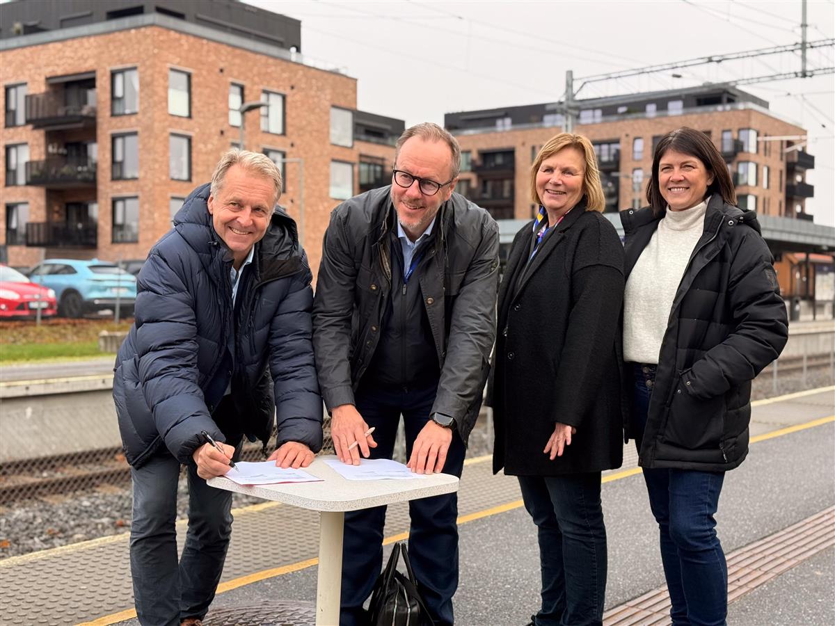 Det ble en gledelig tirsdag formiddag da samarbeidsavtalen mellom Indre Østfold kommune og Bane NOR ble signert, 28. oktober 2025. Fv.: Ordfører Saxe Frøshaug, direktør for strategisk planlegging og driftstjenester i Bane NOR, Eivind Bjurstrøm, direktør for Plan og teknikk i Indre Østfold kommune, Hilde Brandsrud, og varaordfører Kathrine Hestø Hansen.