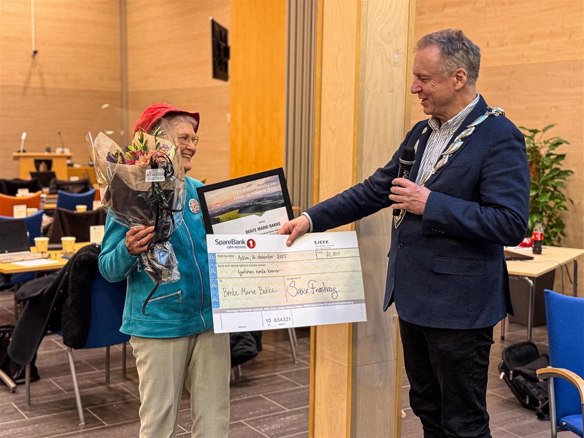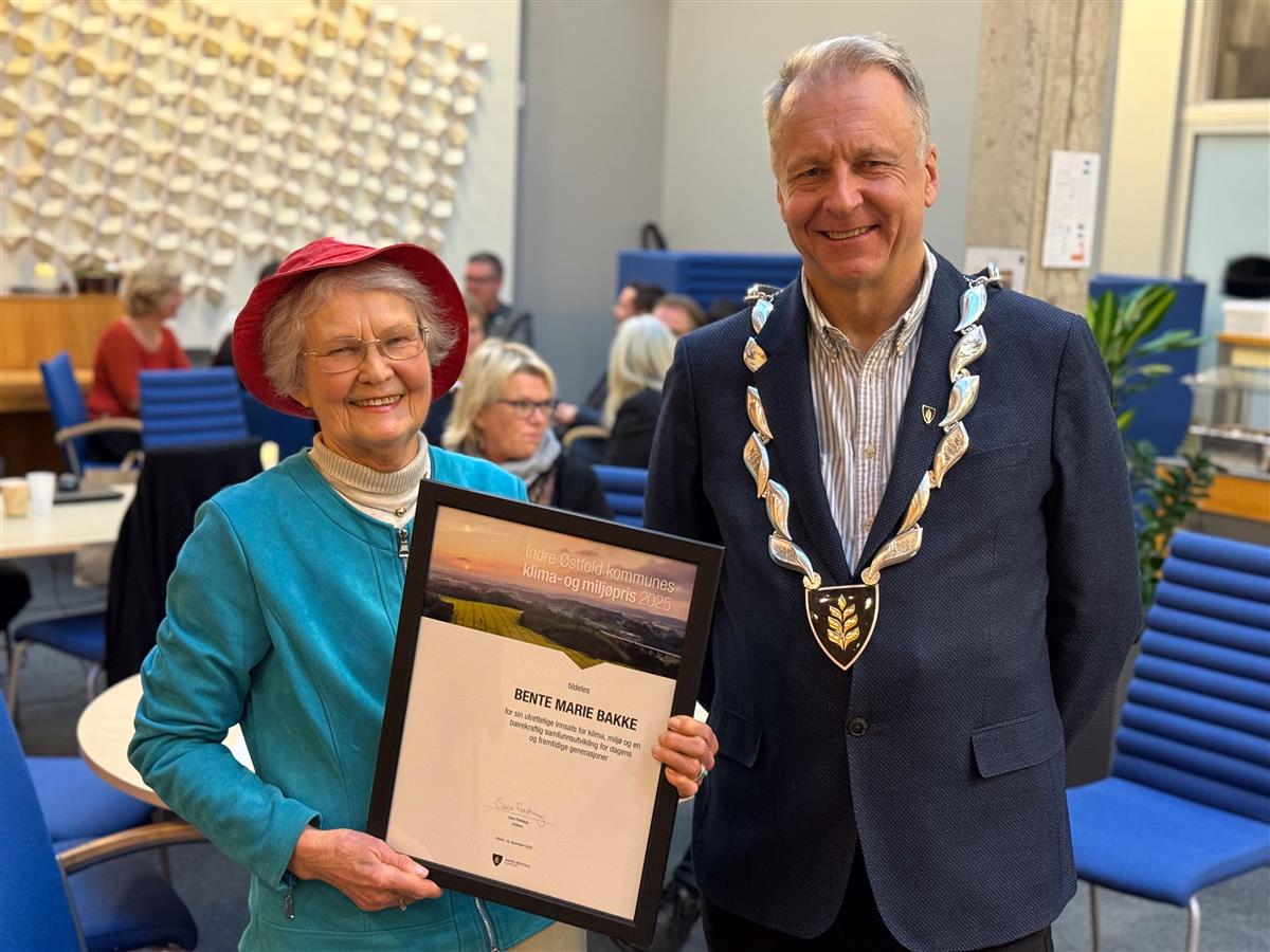Ordfører Saxe Frøshaug overrekker klima- og miljøprisen til Bente Marie Bakke, tirsdag 16. desember.Bente Marie Bakke har i flere tiår vært en utrettelig forkjemper for klima, miljø og bærekraftig samfunnsutvikling, blant annet gjennom sitt arbeid som stortingsrepresentant og som lagleder i Besteforeldrenes klimaaksjon. Hun har vært en tydelig stemme for ansvarlig klimapolitikk og inspirert mange til handling.