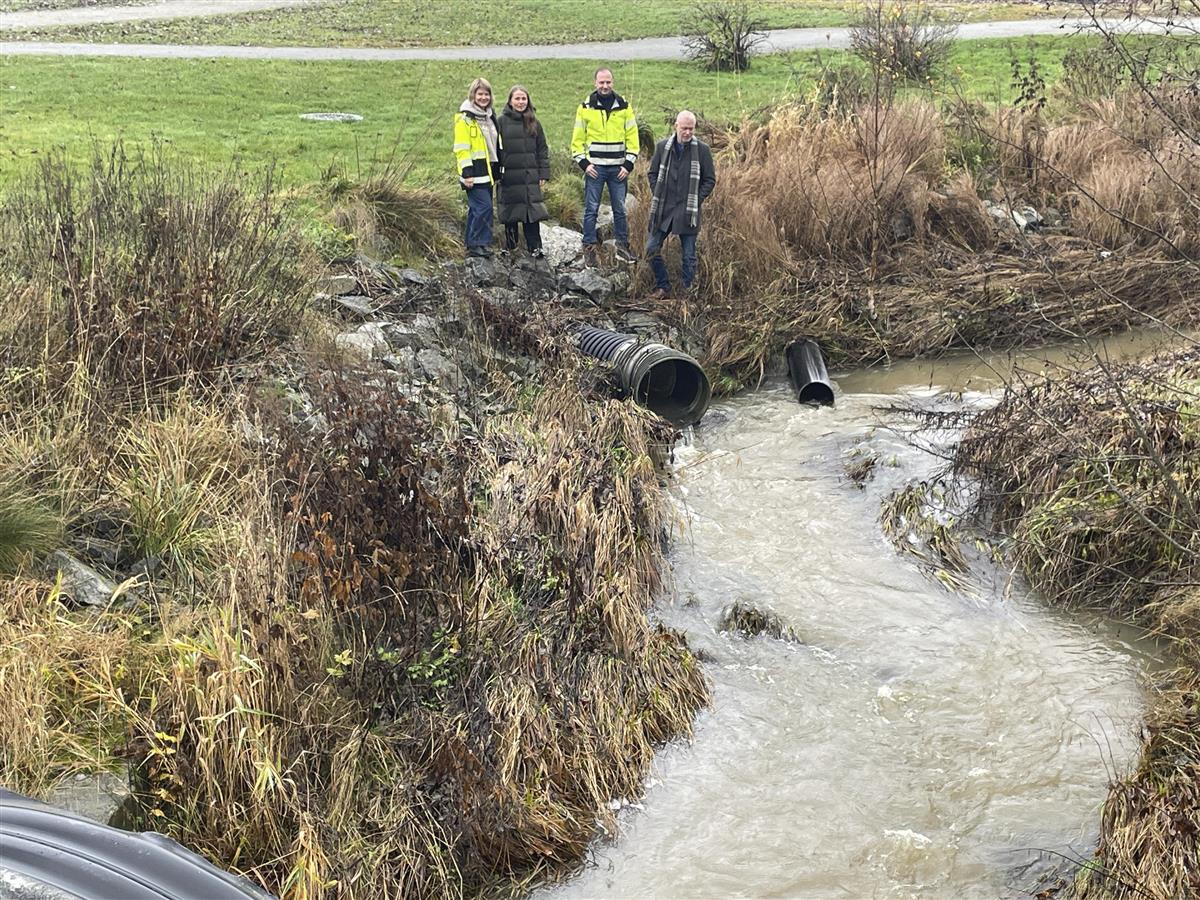 Ved Hyllibekken i Spydeberg viser representanter fra kommunen frem konkrete tiltak som er gjort innen overvannshåndtering.
