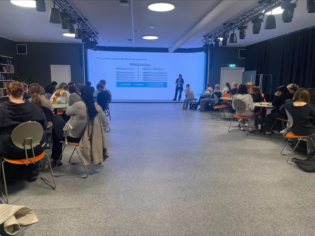 Varaordfører Kathrine Hestø Hansen forklarer hvordan Indre Østfold kommune styres.Gjennom praktiske øvelser, gruppearbeid og møte med blant annet varaordføreren fikk deltakerne trene på ferdigheter som styrker både samspill og demokratisk forståelse, nemlig å lytte, delta, engasjere seg, argumentere og tåle uenighet.
