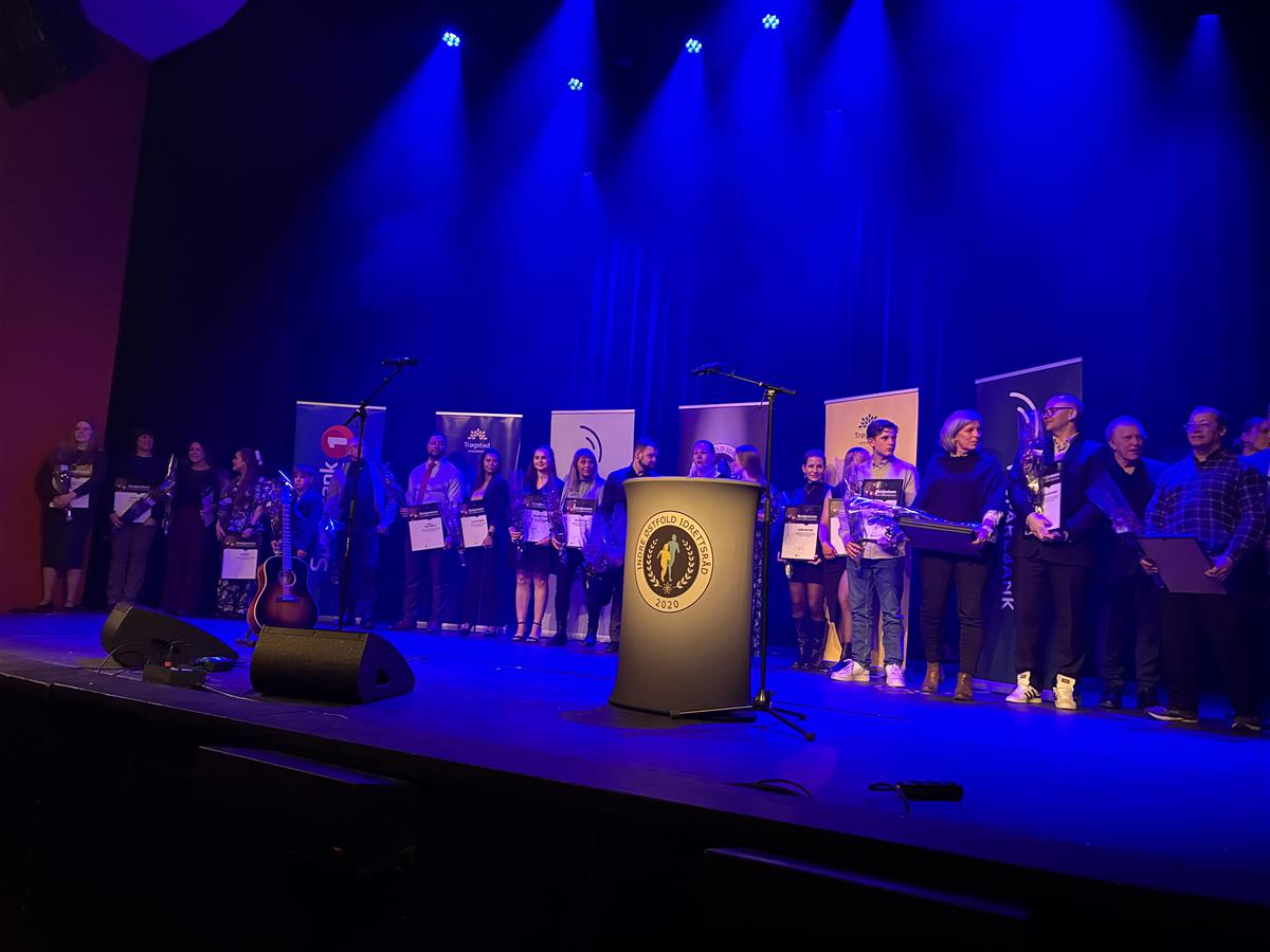 Noen av medaljevinnere fra 2025 på scenen på idrettsgallaen