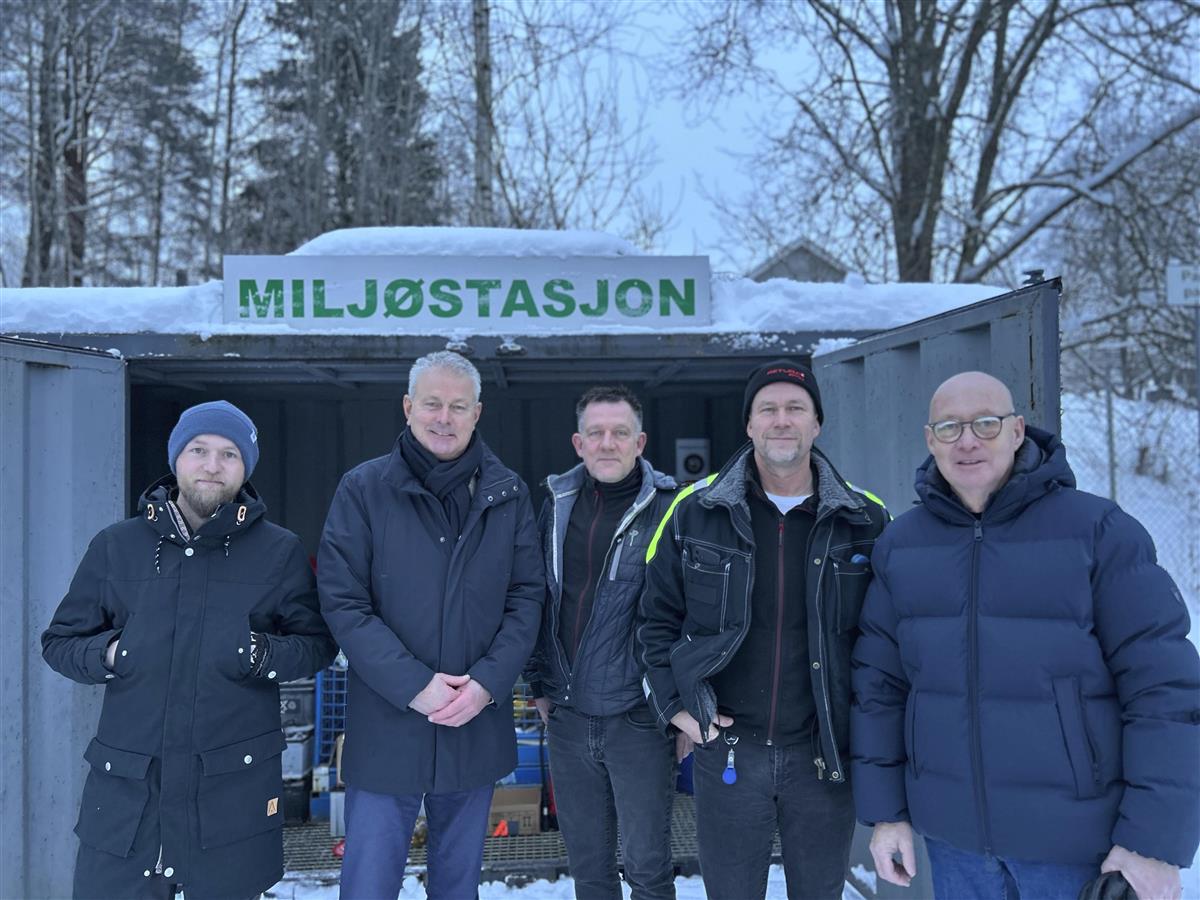 Fra venstre: Marius Glomvik v/Retura Østfold, eiendomssjef Odmund Fintland, Thomas Ingum, administrasjonsleder Retura Østfold, Tom Erik Mellegård, daglig leder i Retura Østfold og Odd Kenneth Sydengen v/ eiendom i Indre Østfold kommune.