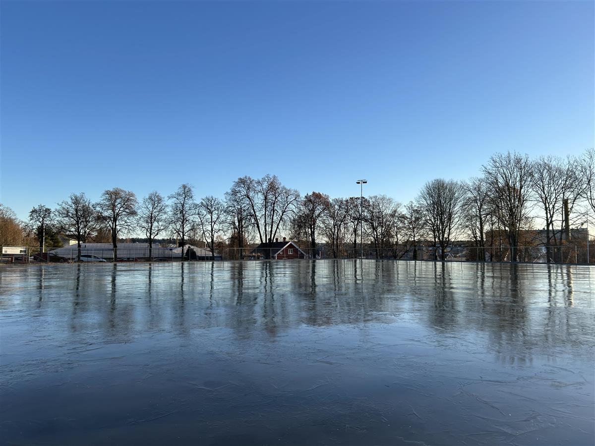 Slik ser området ut per november 2025 -- deler av arenaen er preppet for vinterens skøyteaktiviteter i samarbeid med Askim Beetles HC.