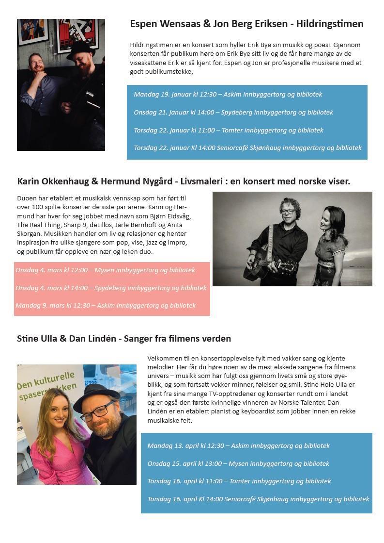 Vi arrangerer konserter på våre sykehjem. Disse konsertene er for beboere på sykehjemmene og omkringliggende omsorgsboliger.