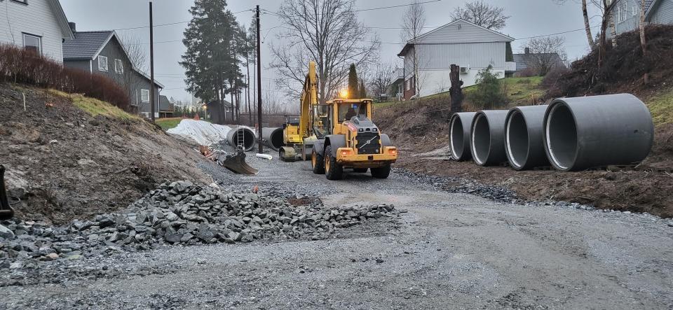 Grunneiermøter med huseiere på begge sider av Osloveien er avholdt og arbeidene startet så smått i uke 38. Nå er Park & Anlegg i full gang med vegetasjonsrydding i ravinedalen mellom Gamle Kirkevei og Granholtveien. Det bygges anleggsvei slik at lastebiler og gravemaskin har god adkomst helt ned til jernbanen for så å starte på overvannsmagasinet og oppfyllingen.