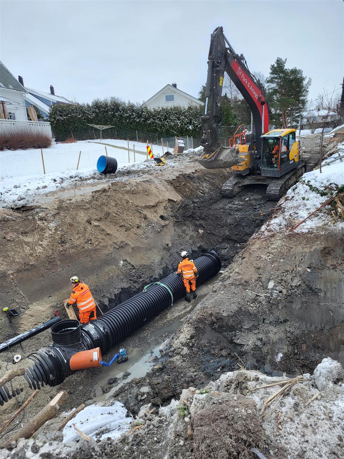 Bilde fra oppfyllingen rundt fordrøyningsmagasinet i området mellom Gamle Kirkevei og Skolegata/Laholmveien
